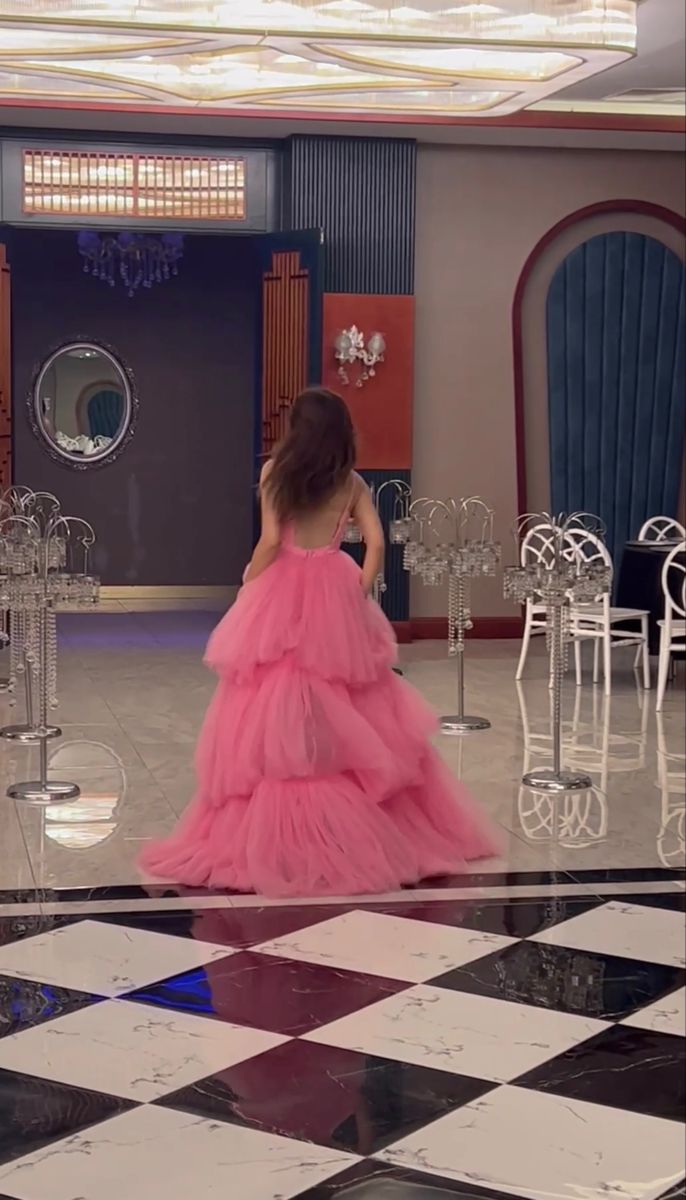 Dreamy Peach Pink Backless Layered Tulle Train Ball Gown Evening Dress cc4856