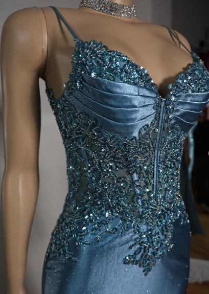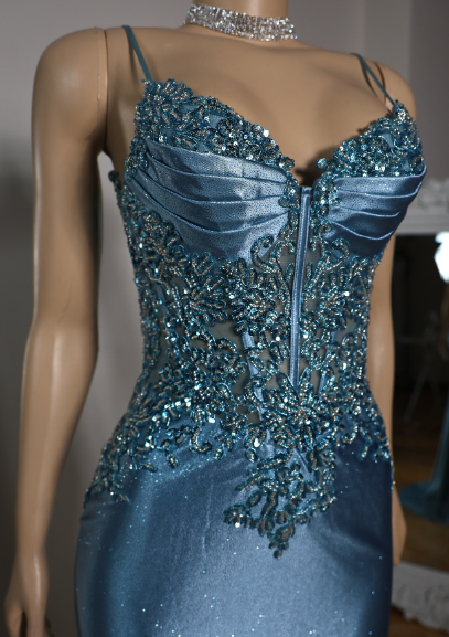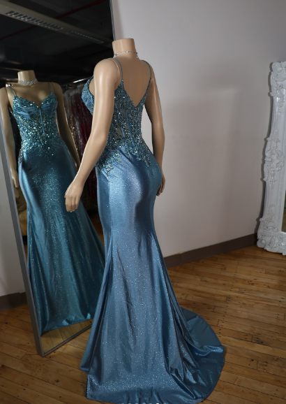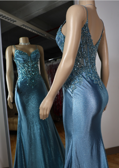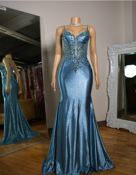 Elegant Blue Mermaid Deep V Halter Beaded Satin Long Prom Dress Evening Dress cc4865