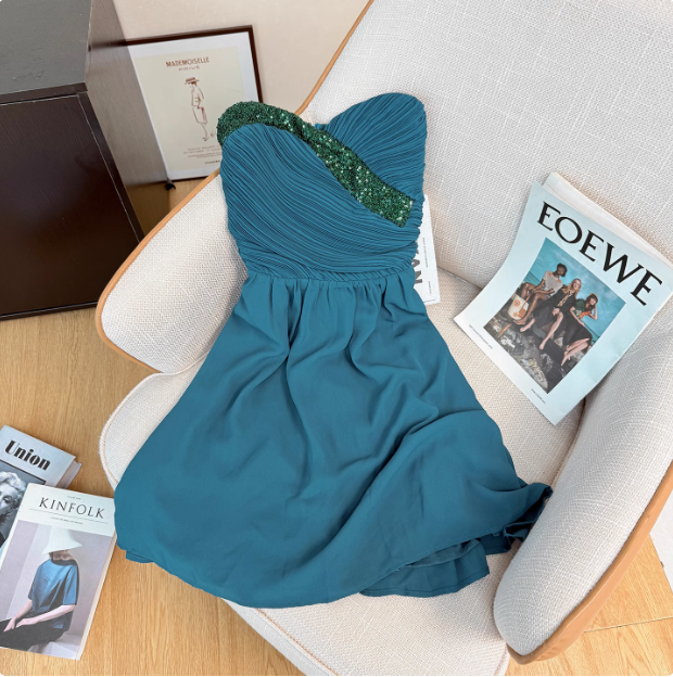 Elegant Strapless Peacock Blue Sequined Chiffon 17th Birthday Homecoming Dress cc3967