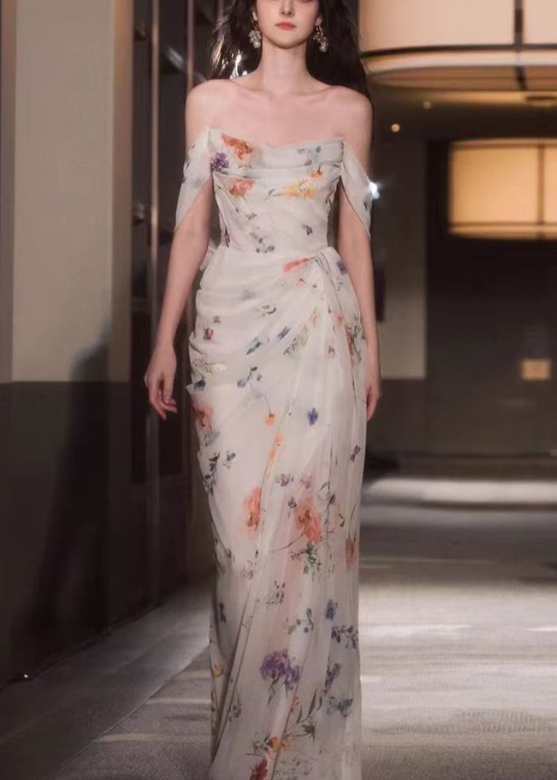 Fairy Chiffon Print Long Mermaid Pleated Evening Dress White Formal Prom Dress cc1481