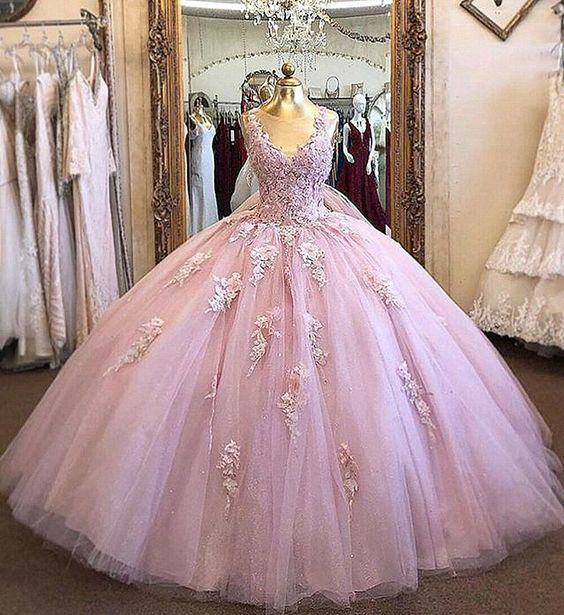 Pink Lace Quinceanera Dresses Sleeveless Sweet 16 Floral Applique Prom Ball Gown C1602
