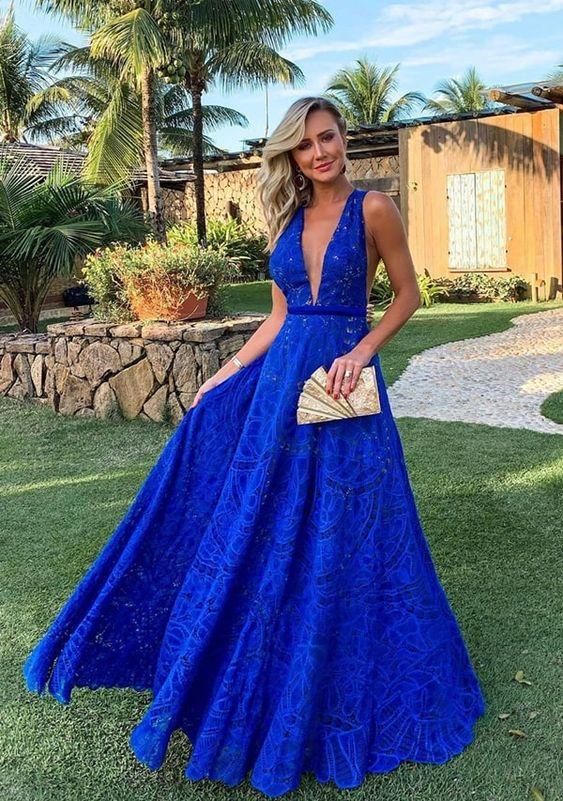 Royal Blue V-neck A-line Lace Prom Dresses C908