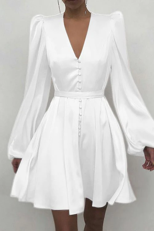 Satin V Neck Puff Long Sleeve Mini Dress Black Short Party Dress cc295