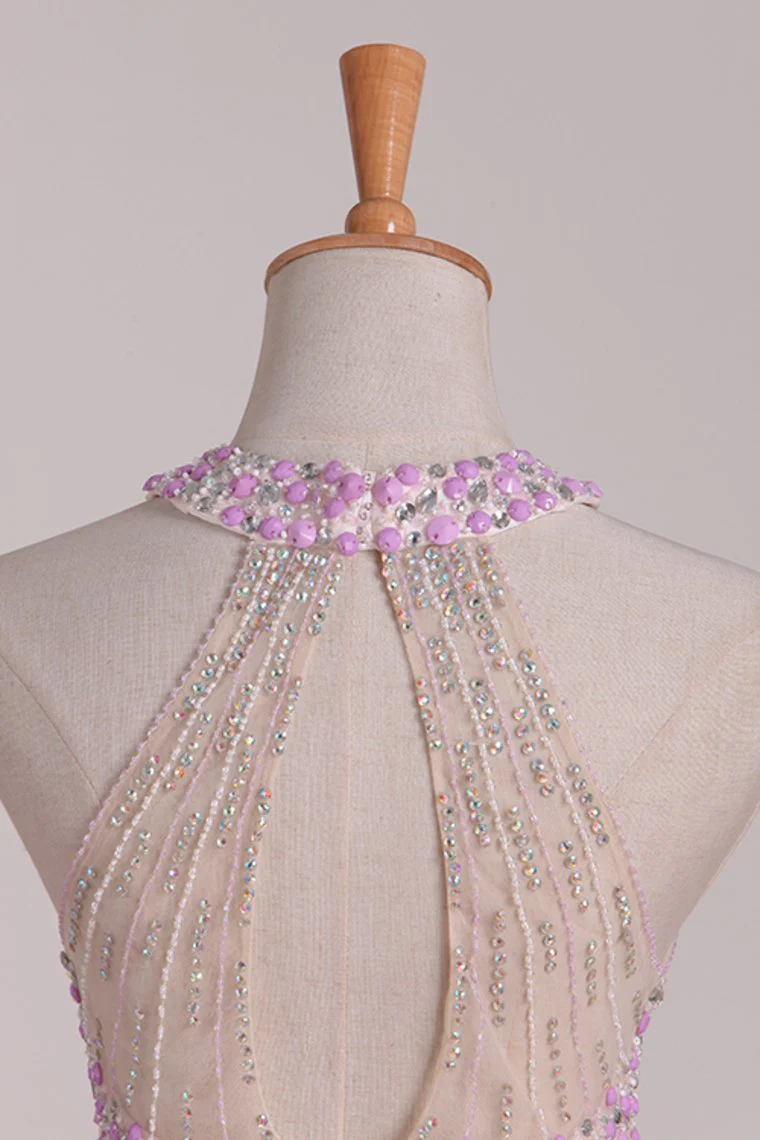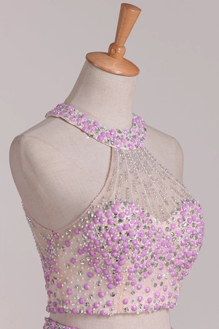Two-Piece Halter Open Back Homecoming Dresses Beaded Bodice Chiffon A Line c2655